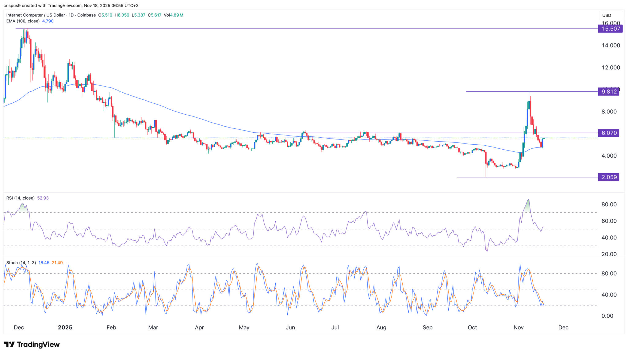 Die Tagesgrafik zeigt, dass ICP Anfang des Monats mit 9,8 $ seinen Höchststand erreichte, als die KI-Token einen Sprung machten. In der vergangenen Woche fiel er dann auf einen Tiefstand von 4,70 $ zurück und fiel damit unter die wichtige Unterstützung bei 6 $.