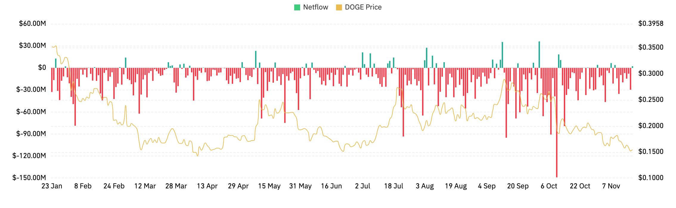 Die Daten von Coinglass zeigen, dass DOGE am 18. November 2,31 Millionen Dollar an Nettozuflüssen verzeichnete. Obwohl dies das Muster der anhaltenden Abflüsse der vergangenen Woche durchbricht, tendiert der übergeordnete Trend weiterhin zur Verteilung statt zur Akkumulation.