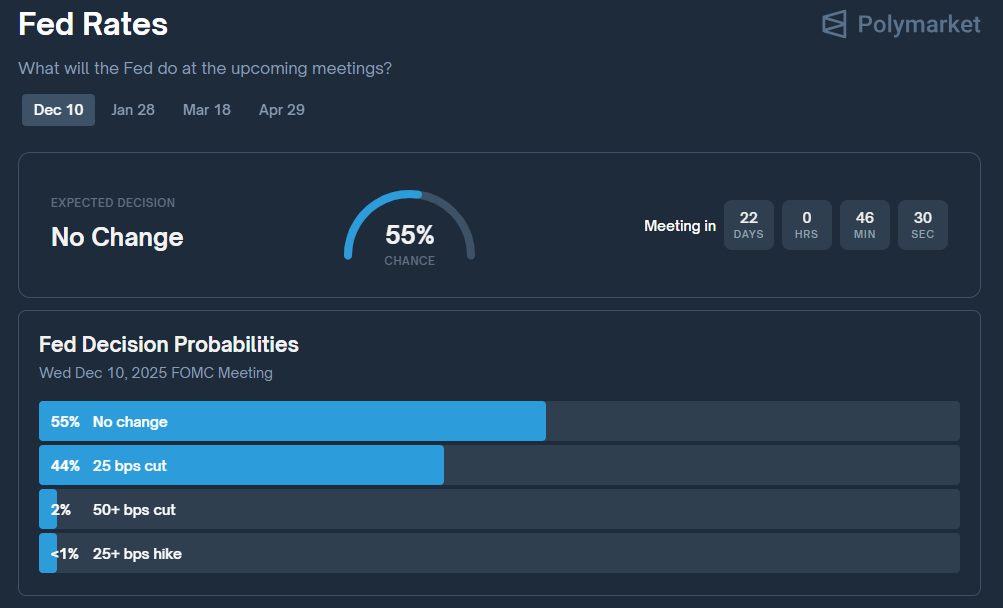 Breitere ökonomische Signale verstärkten den Marktdruck. Der Empire State Manufacturing Index stieg auf 18,7, ein Anstieg um 8 Punkte im Vergleich zum Vormonat. Dieses starke Ergebnis verringerte die Wahrscheinlichkeit einer Zinssenkung der Federal Reserve im Dezember. Die Marktchancen veränderten sich: Polymarket sah die Chance einer unveränderten Politik bei 55 Prozent, während die CME Group Daten eine 60-prozentige Wahrscheinlichkeit für eine unveränderte Politik hervorhob.
