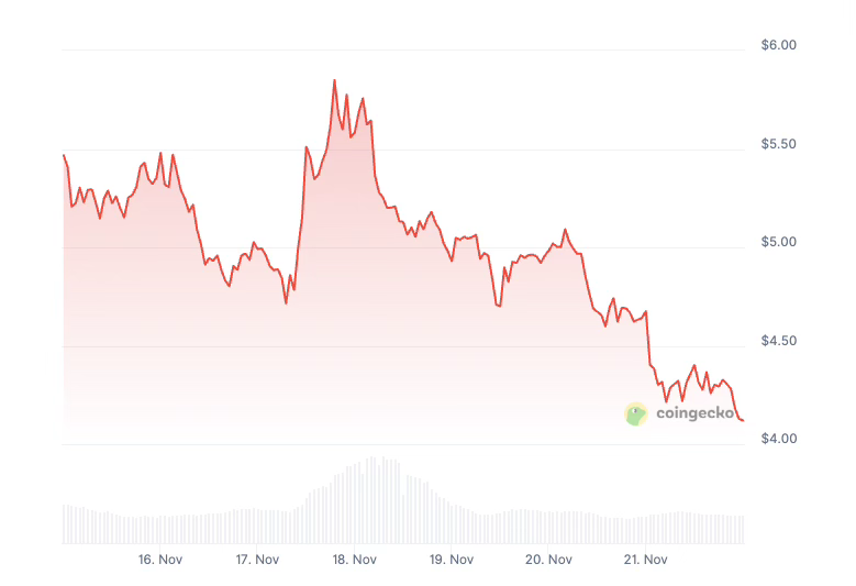 Der Supertrend-Indikator bleibt ebenfalls rot bei 0,5200 $, was bestätigt, dass der Druck im höheren Zeitrahmen nicht verschoben wurde. Während die Erholung von 0,38 $ eine Nachfrage auf niedrigeren Niveaus zeigt, spiegelt die Kursentwicklung dennoch einen Markt wider, der den Abwärtstrend respektiert.
