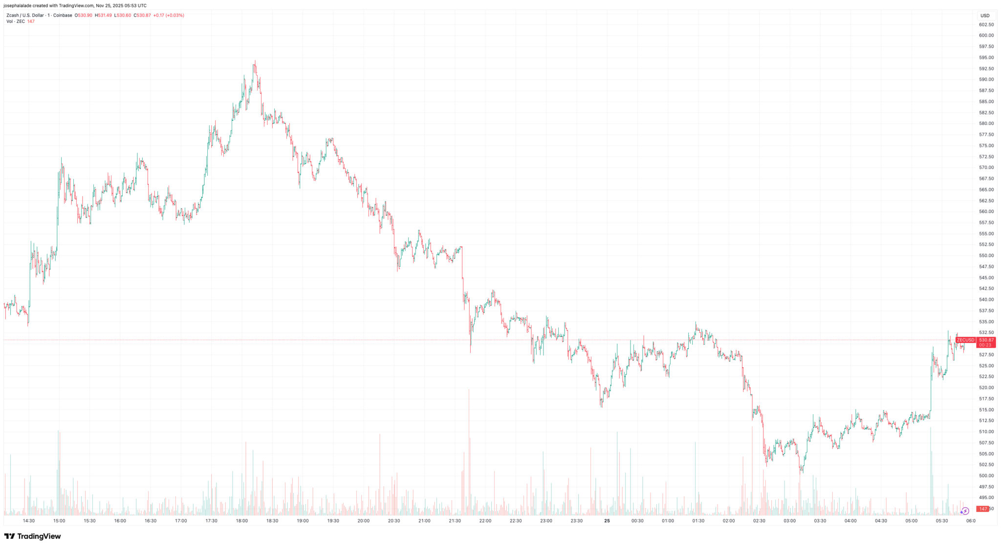 Bis zum späten Abend fiel der Zcash-Kurs auf bis zu $503, schwankte dann eine Zeit lang zwischen $510 und $515, einer Zone am unteren Ende der Handelsspanne dieser Woche, und hält sich nun um $528.