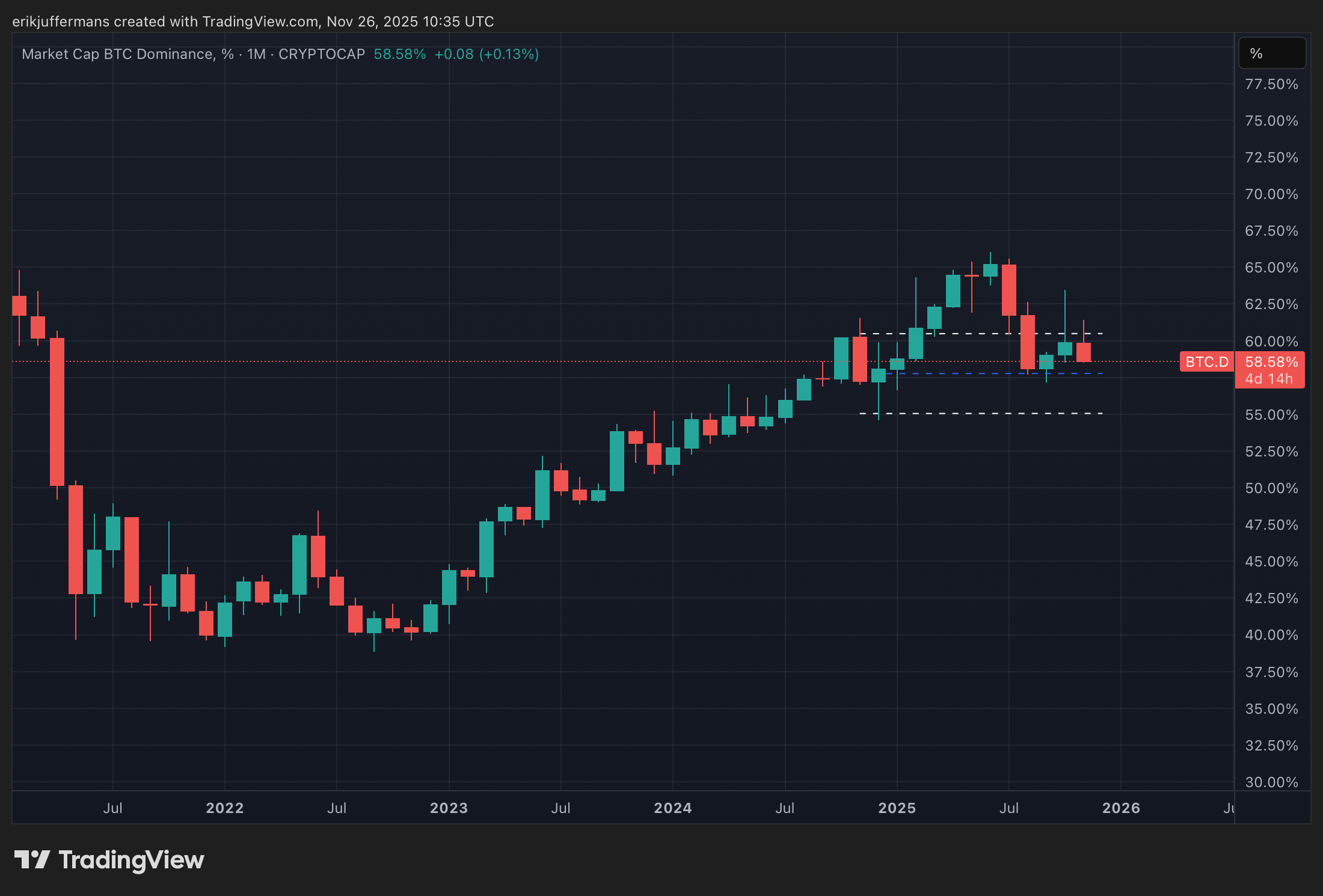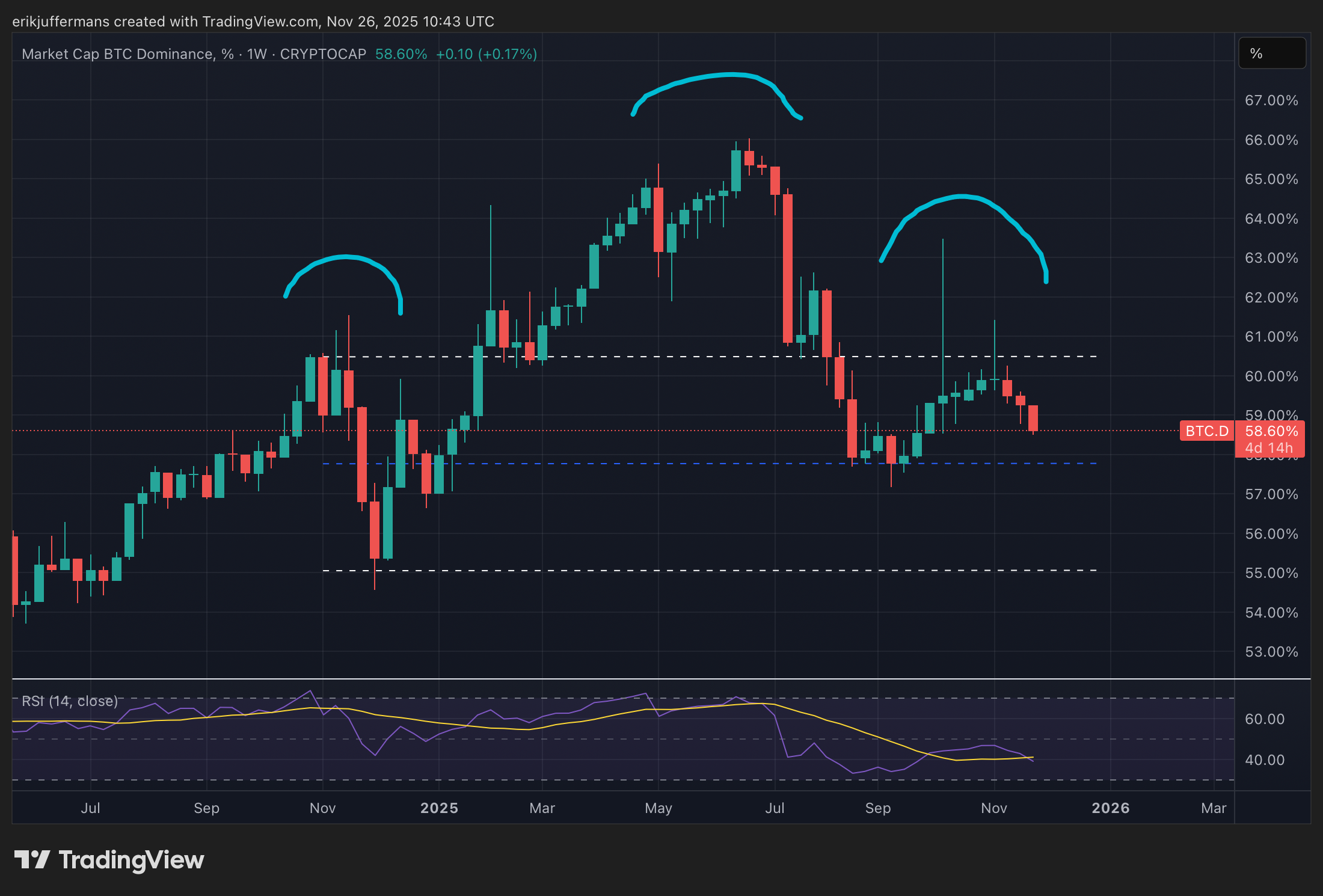 Vorweg kurz zur Einordnung: Warum ist die Grafik der Bitcoin-Dominanz wichtig? Sie zeigt den Wert von Bitcoin im Verhältnis zum gesamten Kryptomarkt. Aktuell steht die BTC.D‑Grafik zum Beispiel bei 58,6 Prozent. Sinkt die Bitcoin-Dominanz, bedeutet das, dass Altcoins einen größeren Anteil einnehmen. Und womöglich stehen wir jetzt am Beginn eines deutlichen Rückgangs.