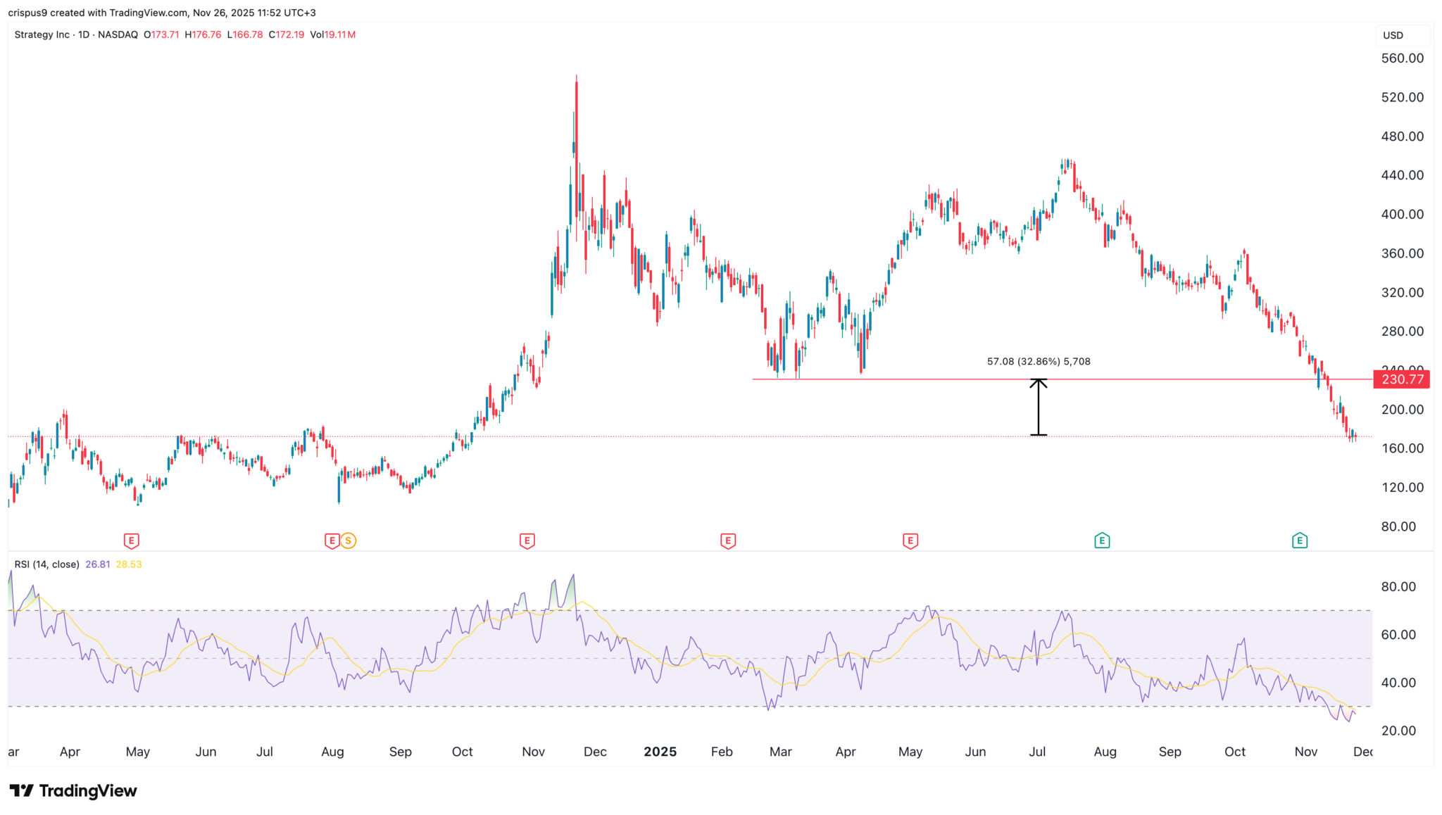 Die MSTR-Aktie befand sich in diesem Jahr in einem starken Abwärtstrend, da Bitcoin stark gefallen ist und das Interesse an Digital Asset Treasury (DAT) Unternehmen nachgelassen hat. Strategy ist auf $175 gefallen, den niedrigsten Stand seit dem 7. Oktober.