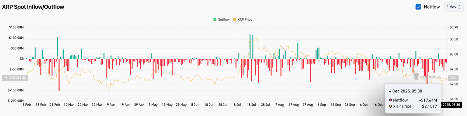 Die Spotflüsse bleiben negativ. Coinglass zeigt am 4. Dezember etwa 17,6 Millionen US-Dollar an Nettoabflüssen. Der Markt hat in der vergangenen Woche eine stetige Welle von Ausflüssen erlebt, was darauf hindeutet, dass Händler Token zurück an die Börsen bringen, um zu verkaufen, nicht zu halten.