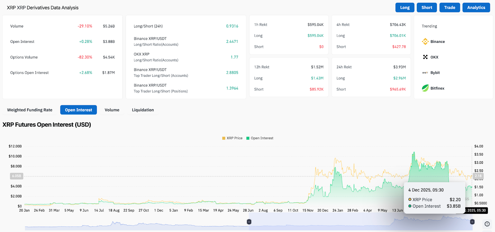 Die Derivatdaten zeigen eine etwas andere Lage. Der offene Zinssatz stieg um etwa 0,28 Prozent auf 3,88 Milliarden US-Dollar. Das bedeutet, dass Händler Positionen öffnen, nicht schließen. Das meiste davon sieht nach einem Aufbau vor einem Ausbruch aus, nicht nach einer bullischen Wette.