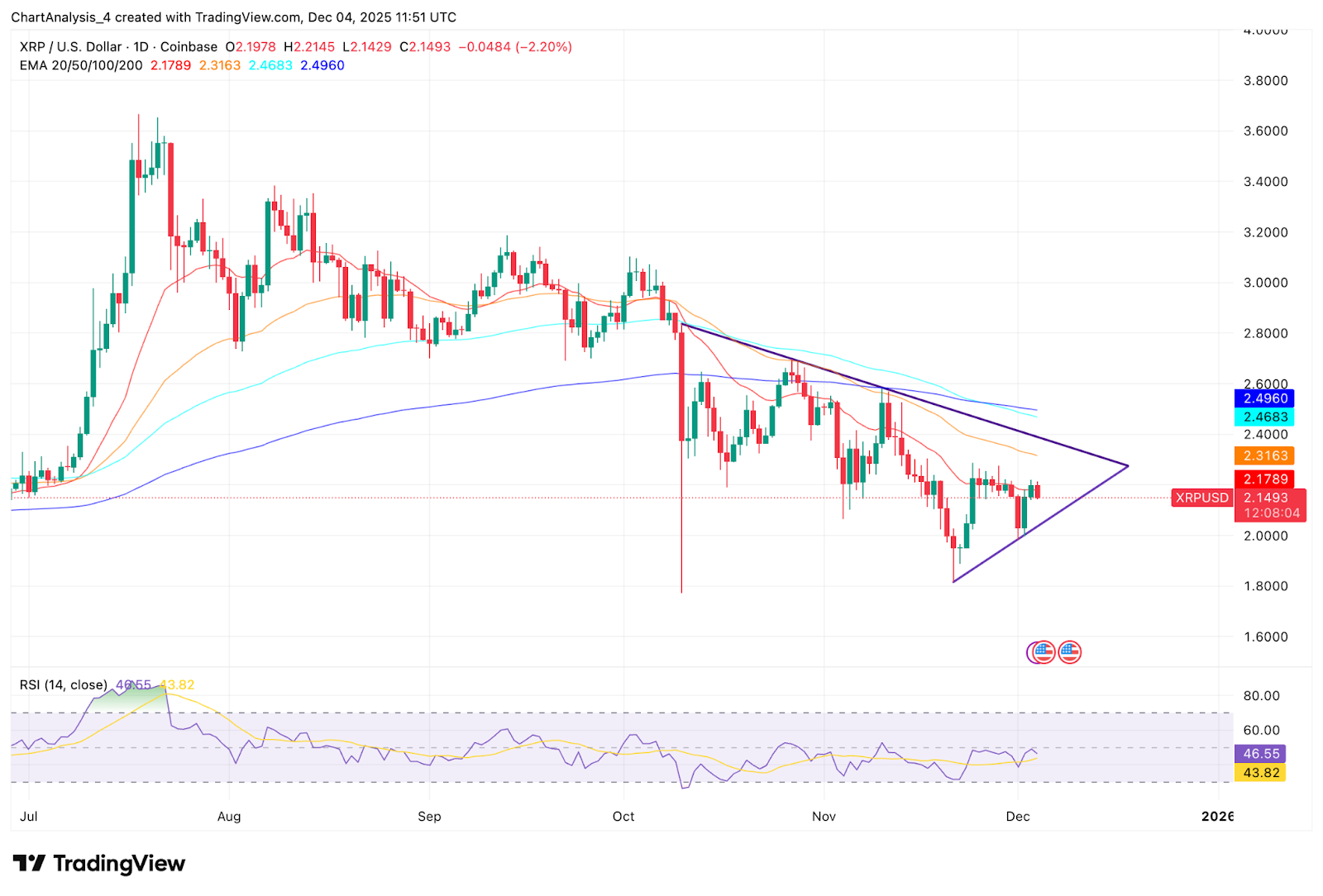 - Der XRP handelt nach wiederholten Ablehnungen bei 2,21 $ nahe 2,15 $ und bildet damit einen sich verschärfenden Keil mit steigendem Ausbruchsrisiko.