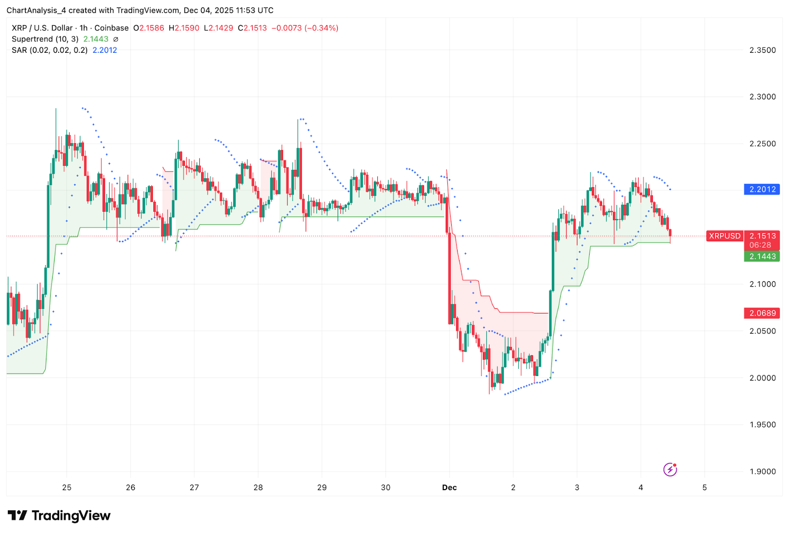 Im 1-Stunden-Chart verliert XRP den kurzfristigen Unterstützungsbereich bei etwa 2,15 $. Das Supertrendband wird rot, und die parabolischen SAR-Punkte drehen sich über den Preis, was meist kurzfristigen Verkaufsdruck bestätigt.