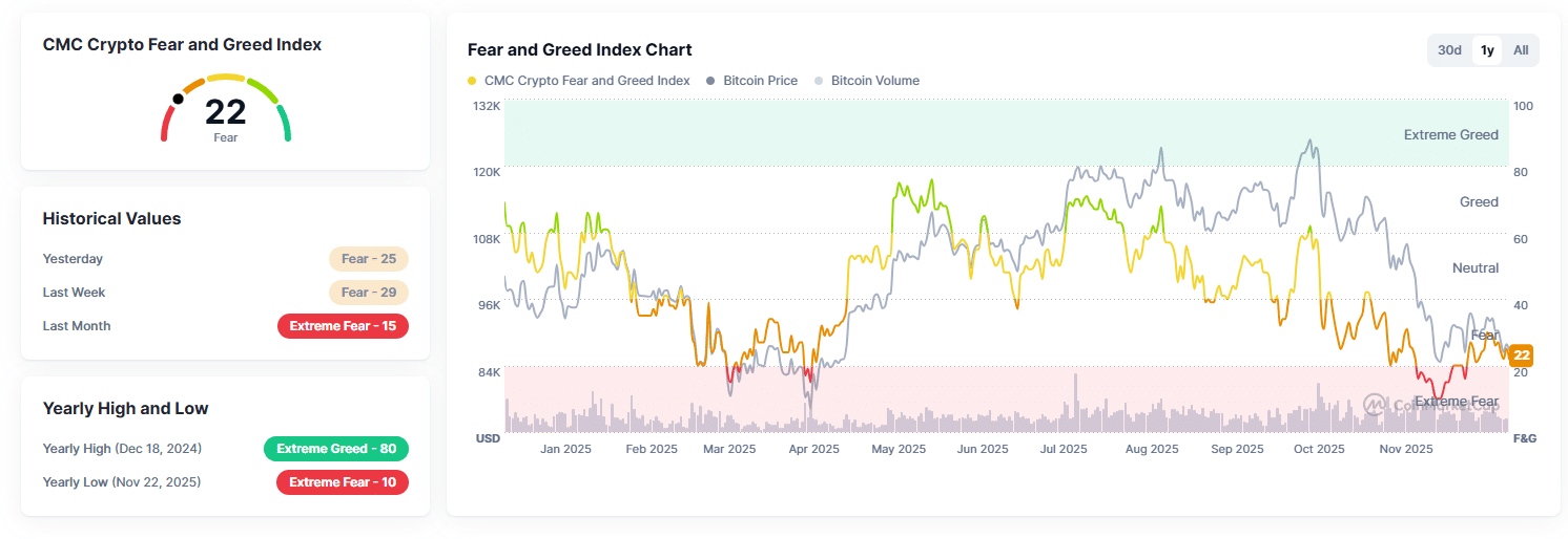 Markt zwar in Angst, aber keine Apokalypse bis jetzt, Quelle: https://coinmarketcap.com/charts/fear-and-greed-index/