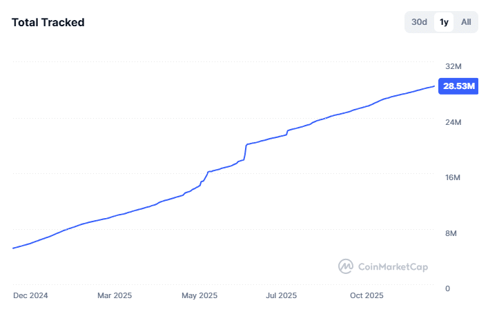 Anzahl der bestehenden KRyptowährungen liegt schon bei über 28,5 Millionen, Quelle: https://coinmarketcap.com/charts/number-of-cryptocurrencies-tracked/