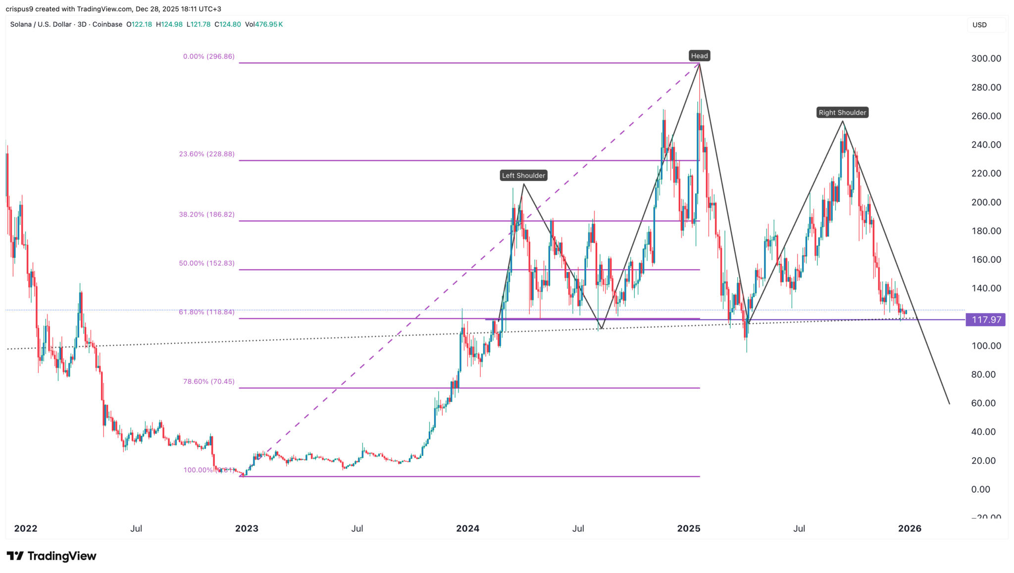 SOL Kurschart | Quelle: TradingViewDer Drei-Tage-Zeitrahmen-Chart zeigt, dass der SOL-Kurs im Jahr 2025 einen Höchststand von 296 $ erreichte und dann auf den aktuellen Stand von 124,57 $ abstürzte. Ein genauerer Blick zeigt, dass der Token ein Kopf-Schulter-Muster gebildet hat. Er befindet sich jetzt an der Nackenlinie, die entlang des 61,8%-Fibonacci-Retracement-Punktes verläuft.