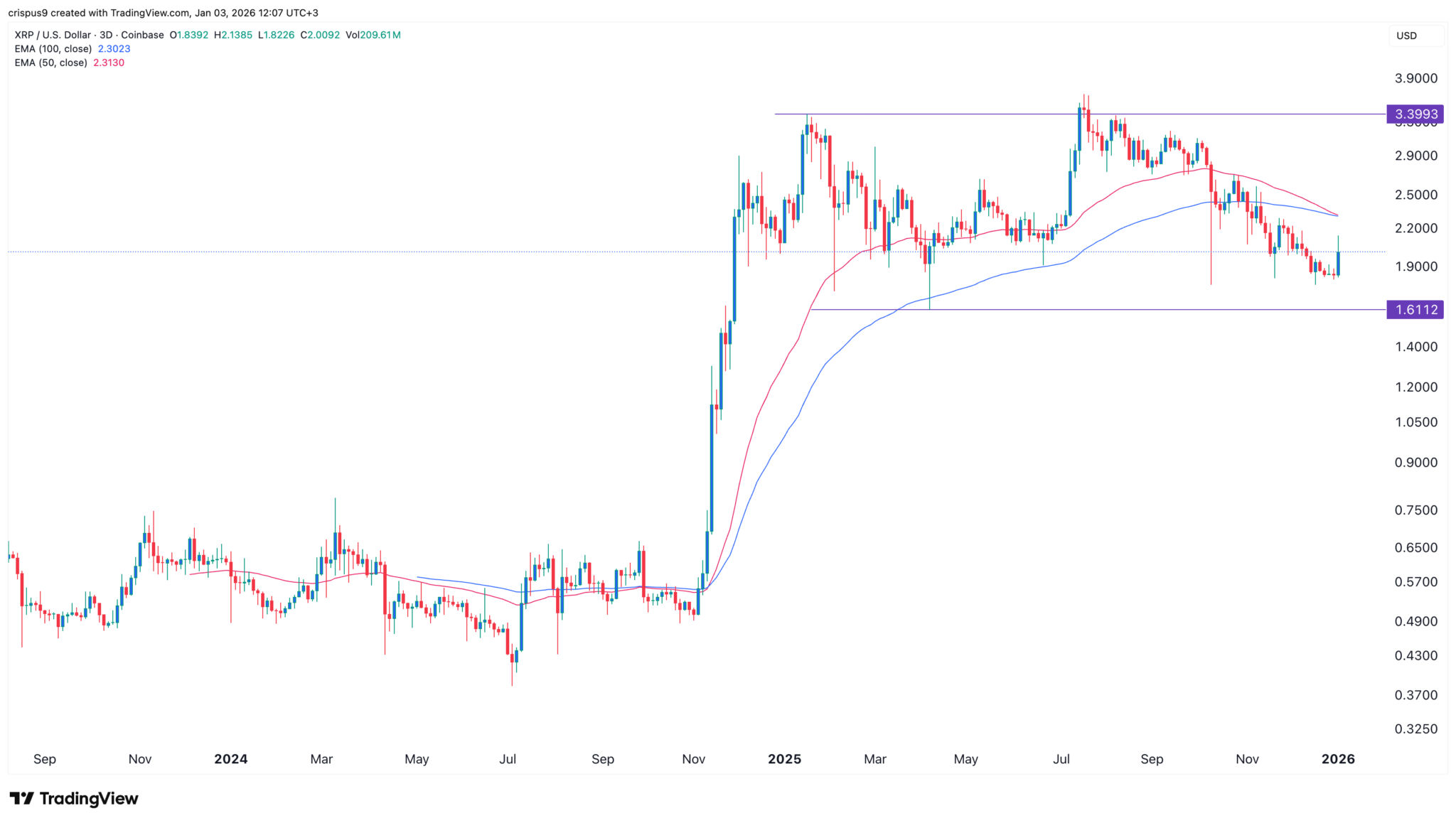 Ein genauerer Blick auf die Tages- und Wochencharts zeigt, dass der Ripple-Kurs gemischte Signale sendet. Auf der positiven Seite zeigt die Tagesgrafik, dass der Coin bei 1,7940 $, seinem Tiefststand im Oktober, November und Dezember, ein Dreifach-Bodenmuster gebildet hat. Dieser Kurs hat ihn in diesen Monaten stark unterstützt und ist ein Zeichen dafür, dass die Bären zögern, Trades unterhalb dieses Wertes zu platzieren.
