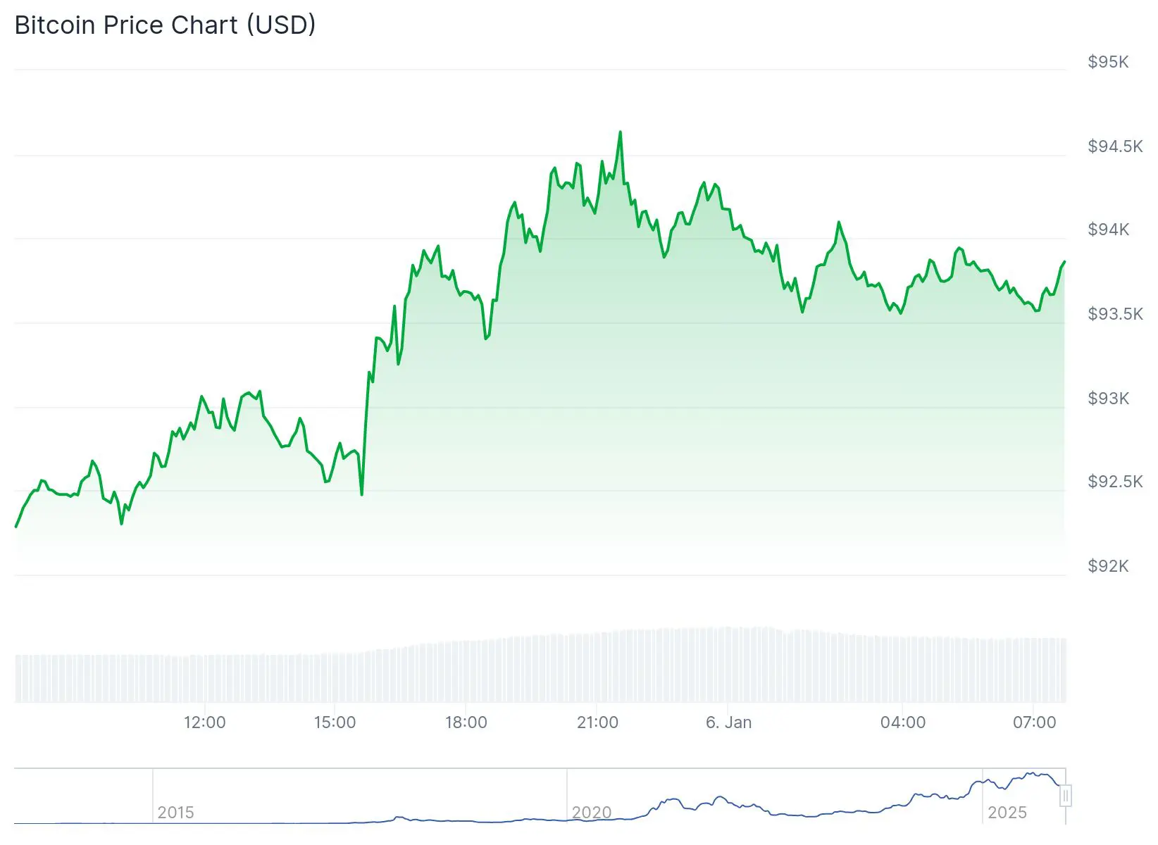 Die Tageskerze wurde knapp unter 94.000 Dollar geschlossen. Das ist das höchste Niveau seit dem 16. November. Im letzten Monat stand der Kurs zwar öfter über 94.000 Dollar, wurde aber jedes Mal innerhalb kürzester Zeit nach unten gedrückt.