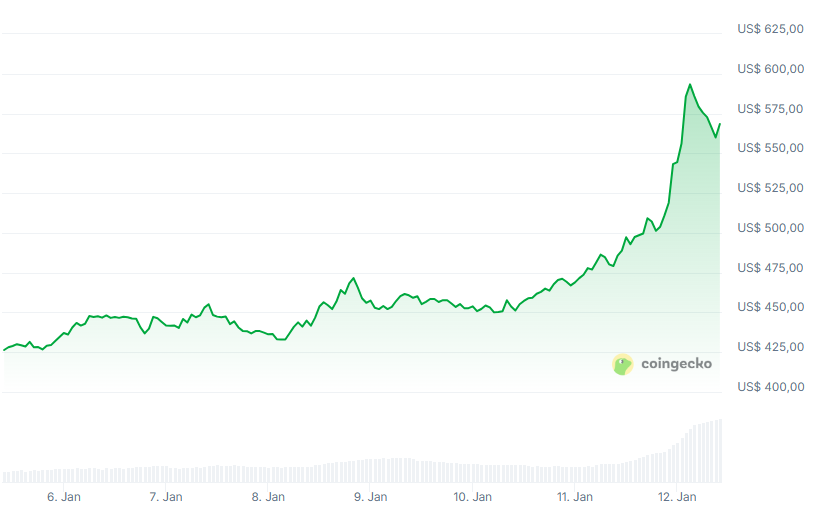 Der Preis von Monero erreichte am Sonntag einen neuen Rekordwert von 596 US-Dollar. Zum Zeitpunkt des Schreibens liegt der Kurs bei etwa 572 US-Dollar, was einem Anstieg von rund 19 % in den letzten 24 Stunden und 34 % in der vergangenen Woche entspricht, wie Daten von CoinGecko zeigen.