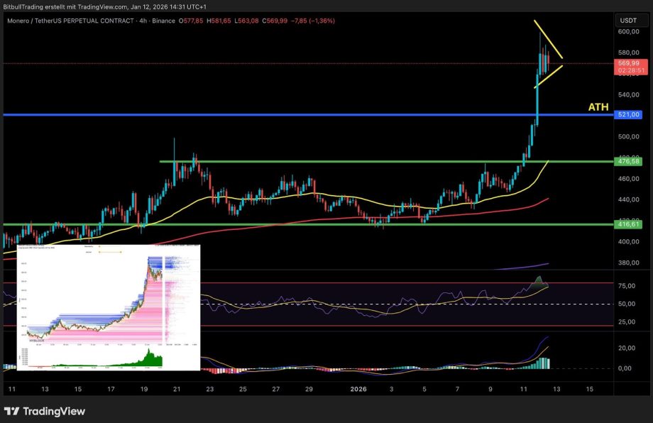 Im 4 Stunden Chart präsentiert sich Monero in einer technisch stark angespannten, zugleich aber weiterhin konstruktiven Ausgangslage. Der Markt befindet sich klar im überkauften Bereich, was durch den RSI (Relative Strength Index) eindeutig bestätigt wird.