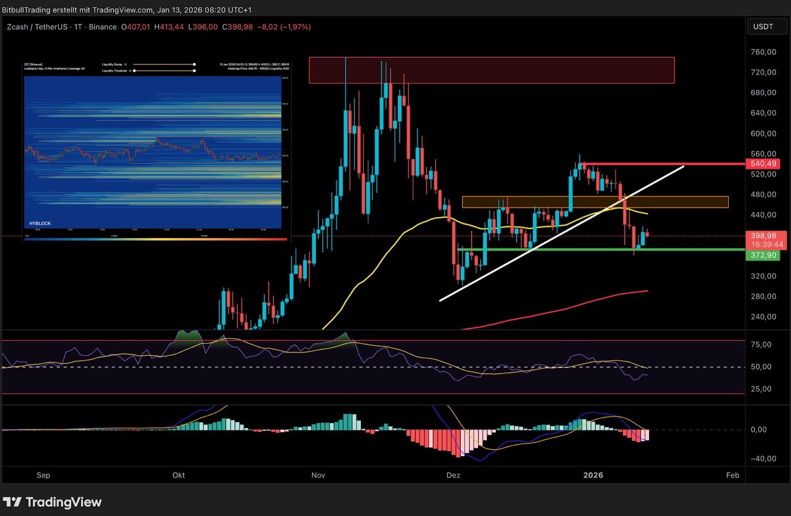 Im Tageschart von Zcash ist zuletzt eine deutliche Trendveränderung zu beobachten. Der Kurs hat die diagonale Aufwärts Supportlinie nach unten durchbrochen und ist anschließend zügig bis zur grünen horizontalen Supportzone bei 37,2 US-Dollar zurückgefallen, wo zunächst eine Stabilisierung eingesetzt hat. Diese Bewegung markiert einen klaren Bruch der zuvor intakten Aufwärtsstruktur und lenkt den Fokus auf die Qualität der aktuellen Unterstützungszone.