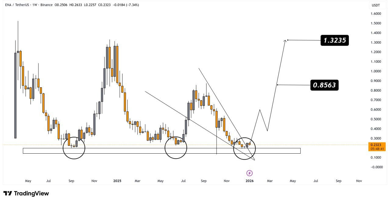 Quelle: @VipRoseTr auf XWorld of Charts stellt fest, dass ENA gerade eine wichtige absteigende Trendlinie testet; ein erfolgreicher Ausbruch könnte eine Erholungsrallye auslösen, die auf eine Verdopplung des aktuellen Kurses abzielt.