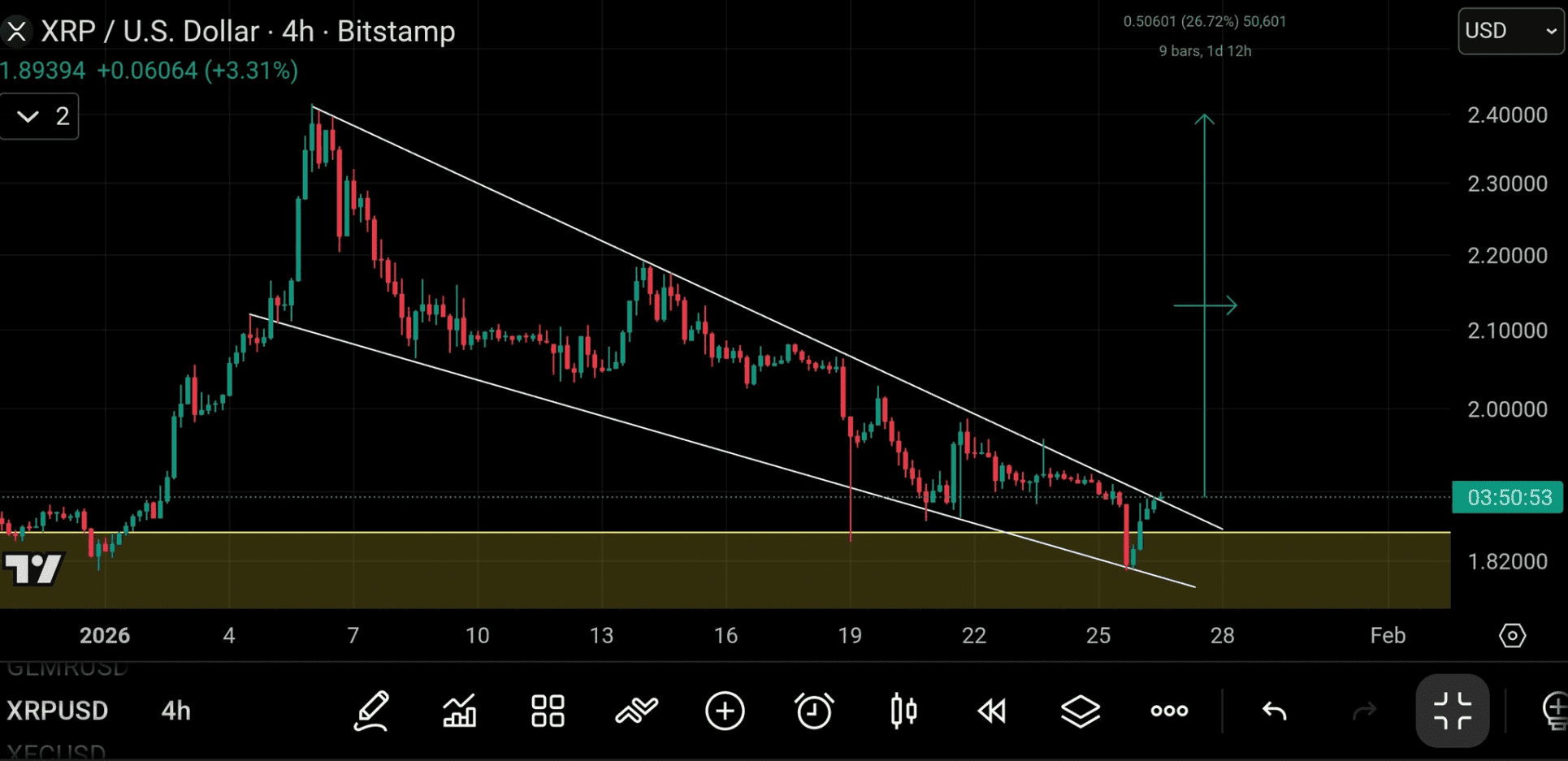 Der Kurs nähert sich nun der oberen Grenze des Keilmusters bei etwa 1,90 Dollar. Wenn $XRP dort überzeugend durchbricht, könnte es schnell gehen. Laut technischer Analyse nimmt der Verkaufsdruck ab, während Käufer bereit sind, einzusteigen.