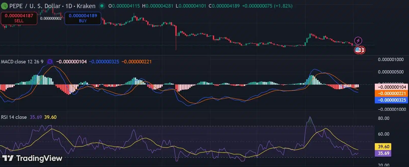 Aktuell befindet sich $PEPE in einer zermürbenden Konsolidierung, gefangen zwischen Hoffnung und weiterer Angst. Ein Blick auf die Indikatoren verrät die Brisanz der Lage: Der RSI (Relative Strength Index) pendelt derzeit nervös zwischen 35 und 40. Das signalisiert zwar noch immer, dass die Bären das Momentum kontrollieren, doch der Indikator nähert sich damit gefährlich der überverkauften Zone. Historisch betrachtet war ein Rutsch unter die 30er-Marke oft der Vorbote für eine finale Kapitulation, auf die fast immer impulsive Rebounds folgten.