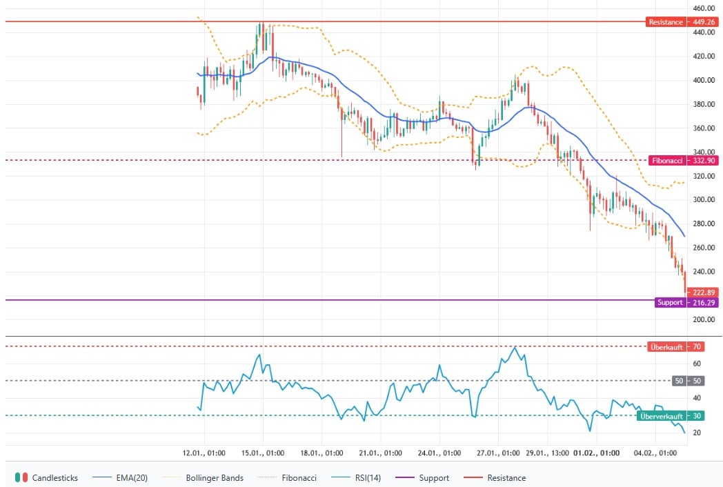 Der Kurs notiert deutlich unter dem gleitenden exponentiellen Durchschnitt der letzten zwanzig Perioden, der bei 268,81 US-Dollar liegt. Die Abfolge tieferer Hochs und tieferer Tiefs bestätigt eine kurzfristige Schwäche. Eine naheliegende Unterstützung liegt am Tagestief bei 216,29 US-Dollar. Unmittelbare Widerstände liegen bei 251,84 US-Dollar, was dem letzten Range Bounce entspricht, sowie am gleitenden exponentiellen Durchschnitt der letzten zwanzig Perioden bei 268,81 US-Dollar. Solange der Kurs unter diesem gleitenden Durchschnitt bleibt, bleibt die Marktlage klar bärisch.
