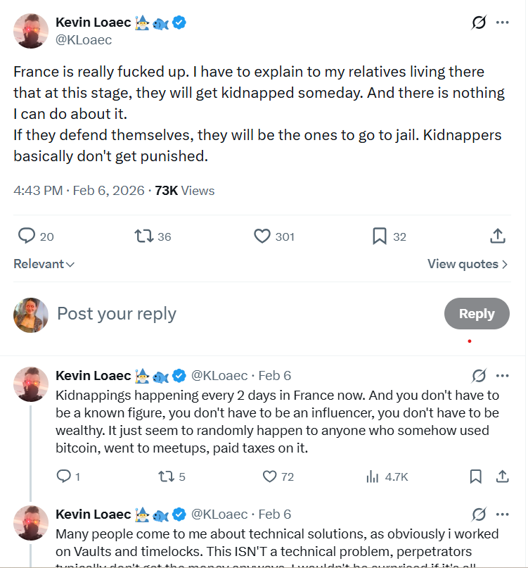 Der französische Bitcoin-Entwickler und Gründer Kevin Loaec schlug ebenfalls Alarm auf X und schrieb, dass „Frankreich wirklich am Arsch ist“. Er sagte, er müsse seinen dort lebenden Verwandten erklären, dass „sie in dieser Situation irgendwann entführt werden. Und ich kann nichts dagegen tun.“