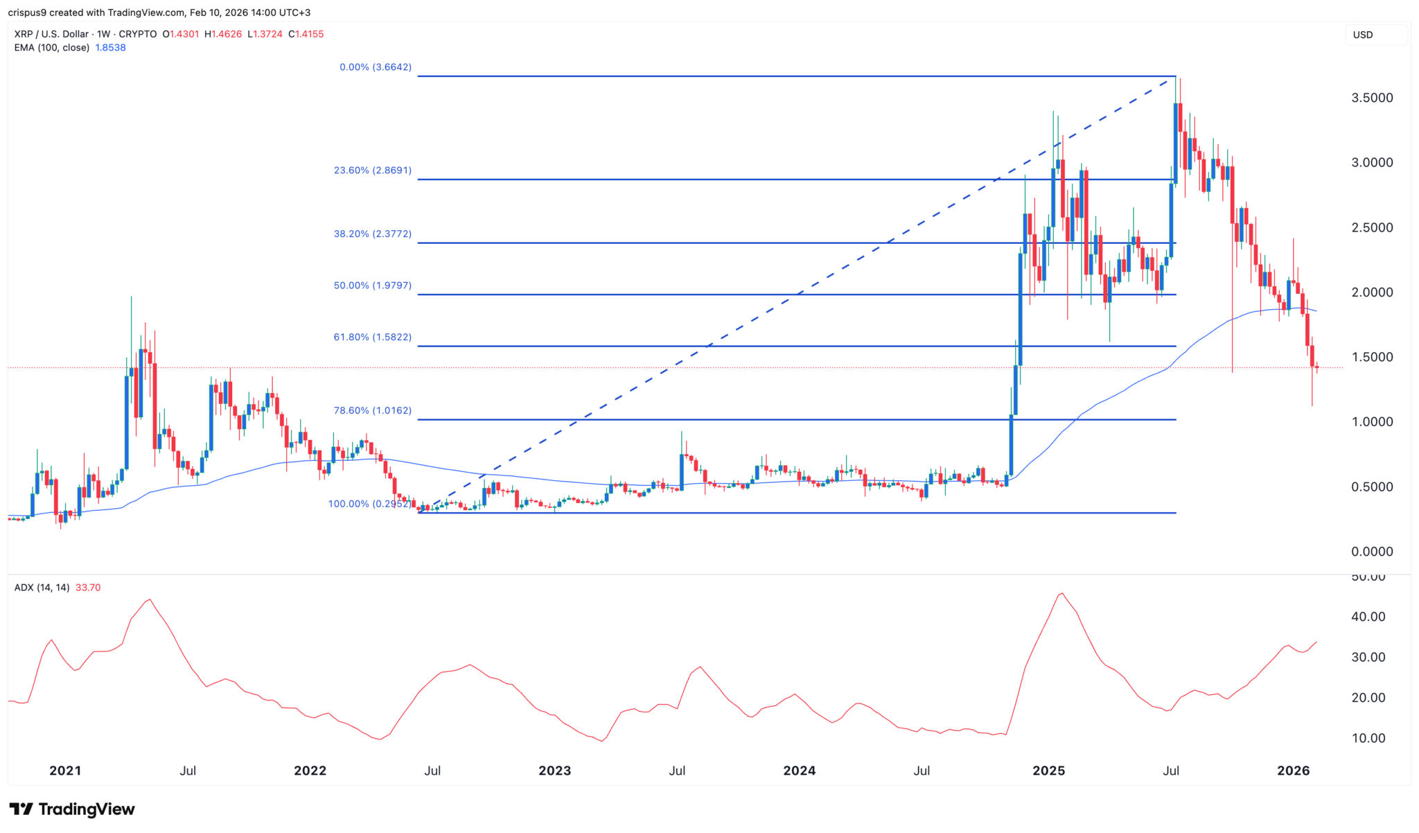 Der Ripple-Token ist unter das wichtige 61,8 %-Fibonacci-Retracement-Niveau gefallen, was den anhaltenden Abwärtstrend bestätigt. Er ist auch unter den exponentiellen gleitenden Durchschnitten (EMA) von 50 und 100 Wochen gefallen, während der Average Directional Index (ADX) auf 33 gestiegen ist, den höchsten Stand seit März letzten Jahres.