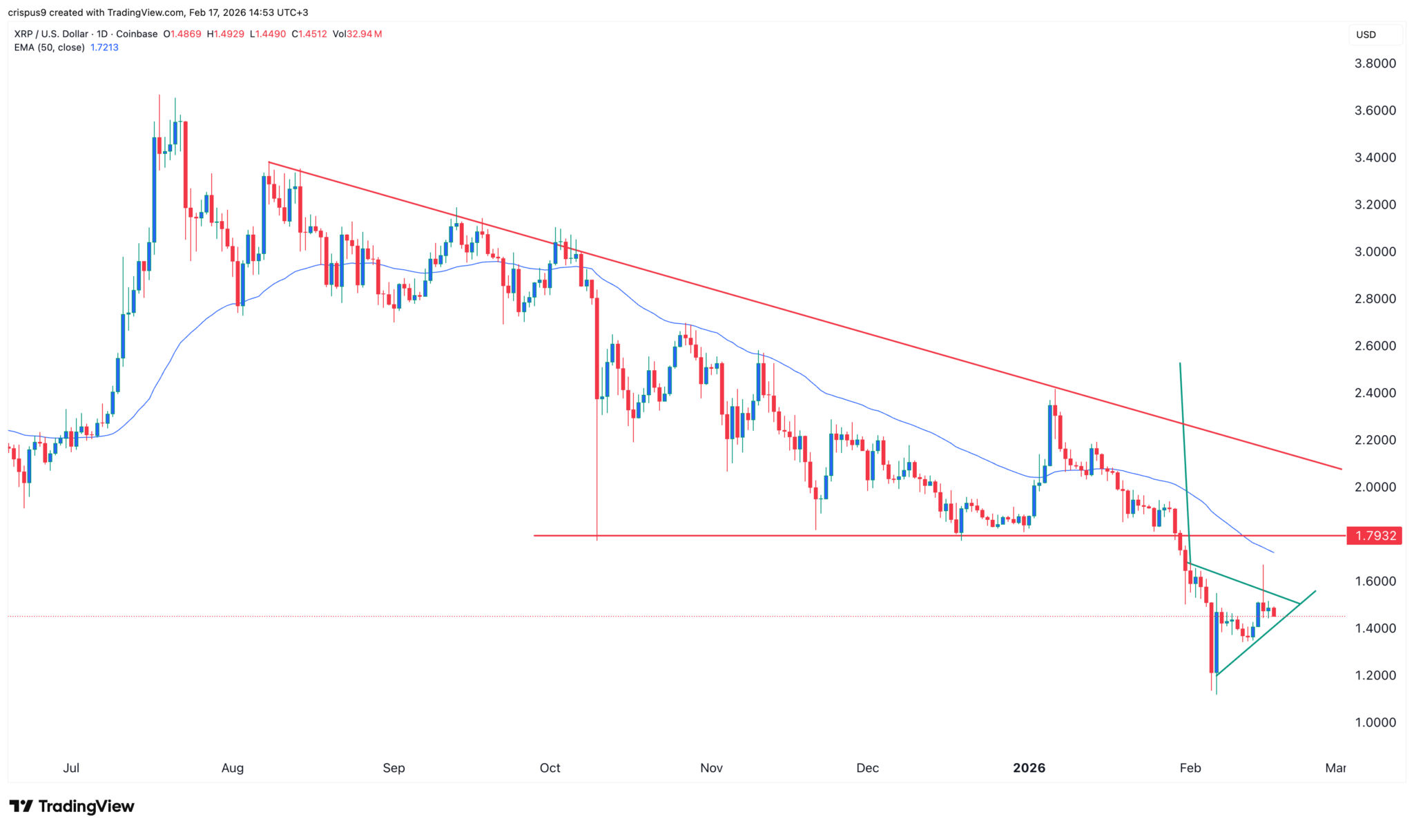 Daher ist die wahrscheinlichste $XRP-Prognose bärisch, wobei das nächste wichtige Ziel das Jahrestief von 1,1245 $ ist. Ein Anstieg über den Widerstand bei 1,7932 $ würde den bärischen Ausblick ungültig machen.