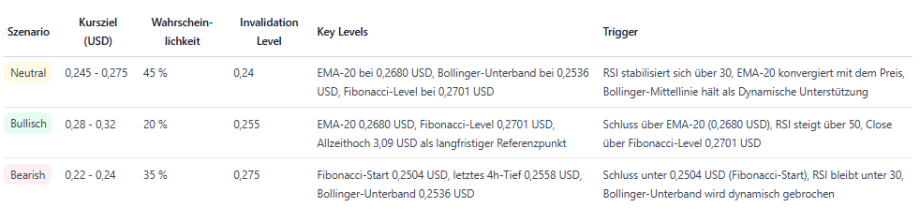 Ein Ausbruch über 0,2701 USD könnte eine Erholung in Richtung 0,285–0,300 USD auslösen, während ein Bruch unter 0,2504 USD weiteres Abwärtspotenzial bis 0,22–0,24 USD freisetzen würde.
