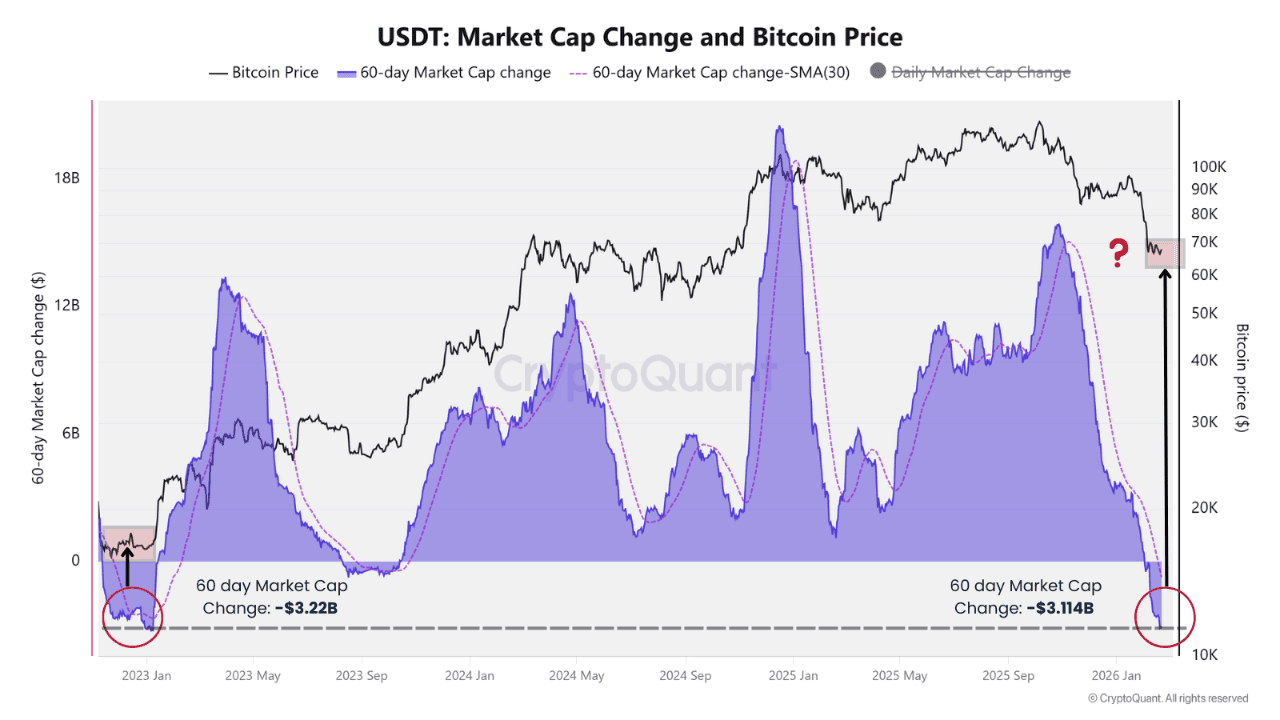 Die Marktkapitalisierung von Tether ($USDT) ist innerhalb von sechzig Tagen um mehr als 3,1 Milliarden Dollar gesunken. Laut Analyst Moreno ist dies, basierend auf Daten von CryptoQuant, ein seltenes Phänomen.
