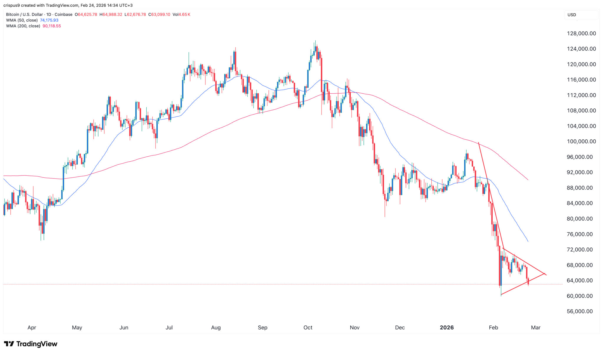 Darüber hinaus deutet die technische Analyse darauf hin, dass der Bitcoin-Kurs in den kommenden Wochen weiter fallen könnte. Es hat sich ein Death Cross gebildet, da sich der 50-Tage- und der 200-Tage-Exponential Moving Average gekreuzt haben. Außerdem hat sich ein bärisches Pennant-Muster gebildet, das auf weitere Abwärtsbewegungen hindeutet, möglicherweise bis zum wichtigen Unterstützungsniveau bei 50.000 US-Dollar.