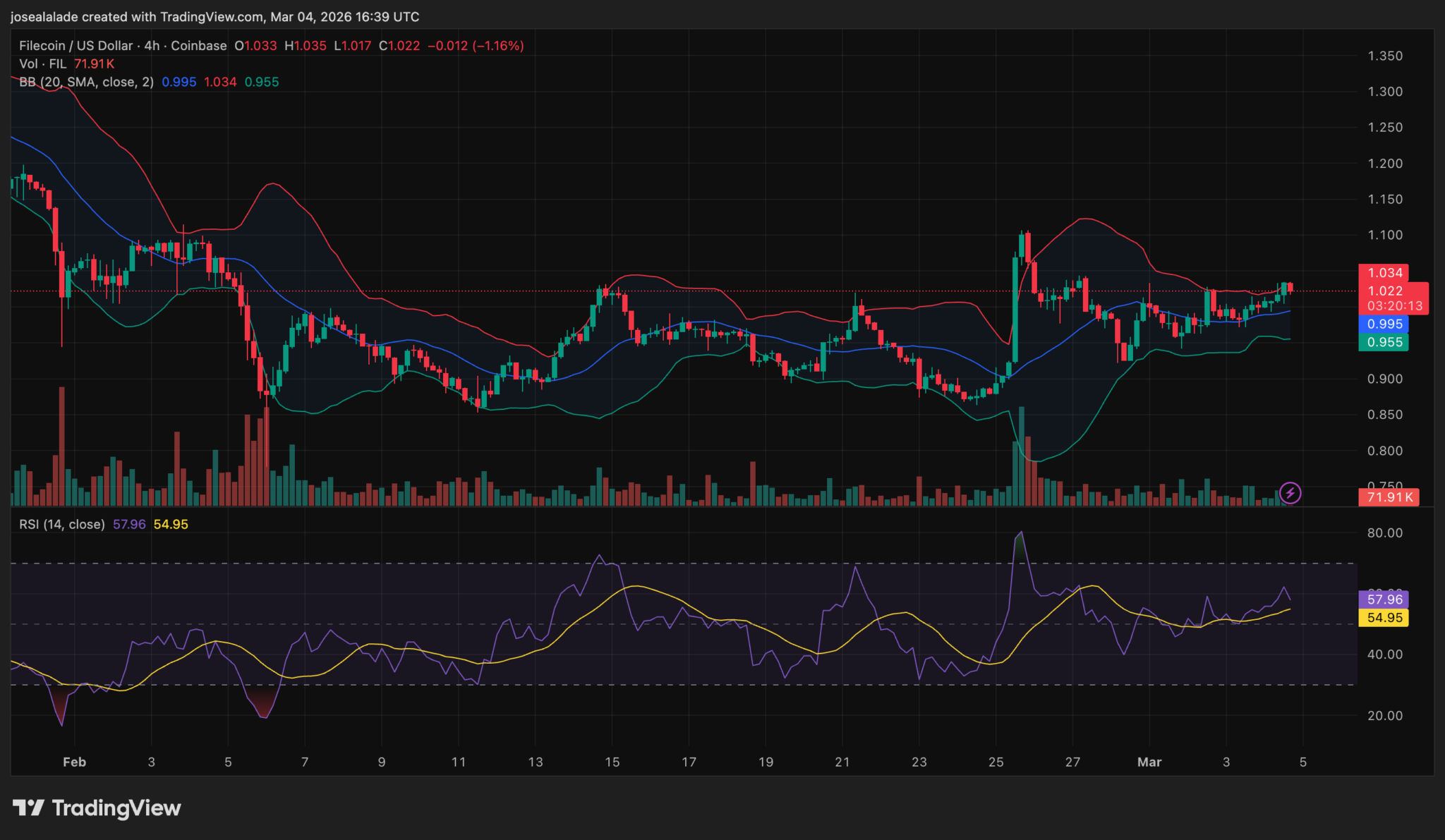 Auf dem 4-Stunden-Chart wird Filecoin bei 1,021 USD gehandelt, knapp unterhalb der Mittellinie des Bollinger-Bandes, wobei das obere Band bei 1,034 USD und das untere bei 0,955 USD liegt. Die Bänder verengen sich, ein Kompressionsmuster, das in der Regel mit einem Richtungsbruch statt einer anhaltenden Seitwärtsbewegung endet.