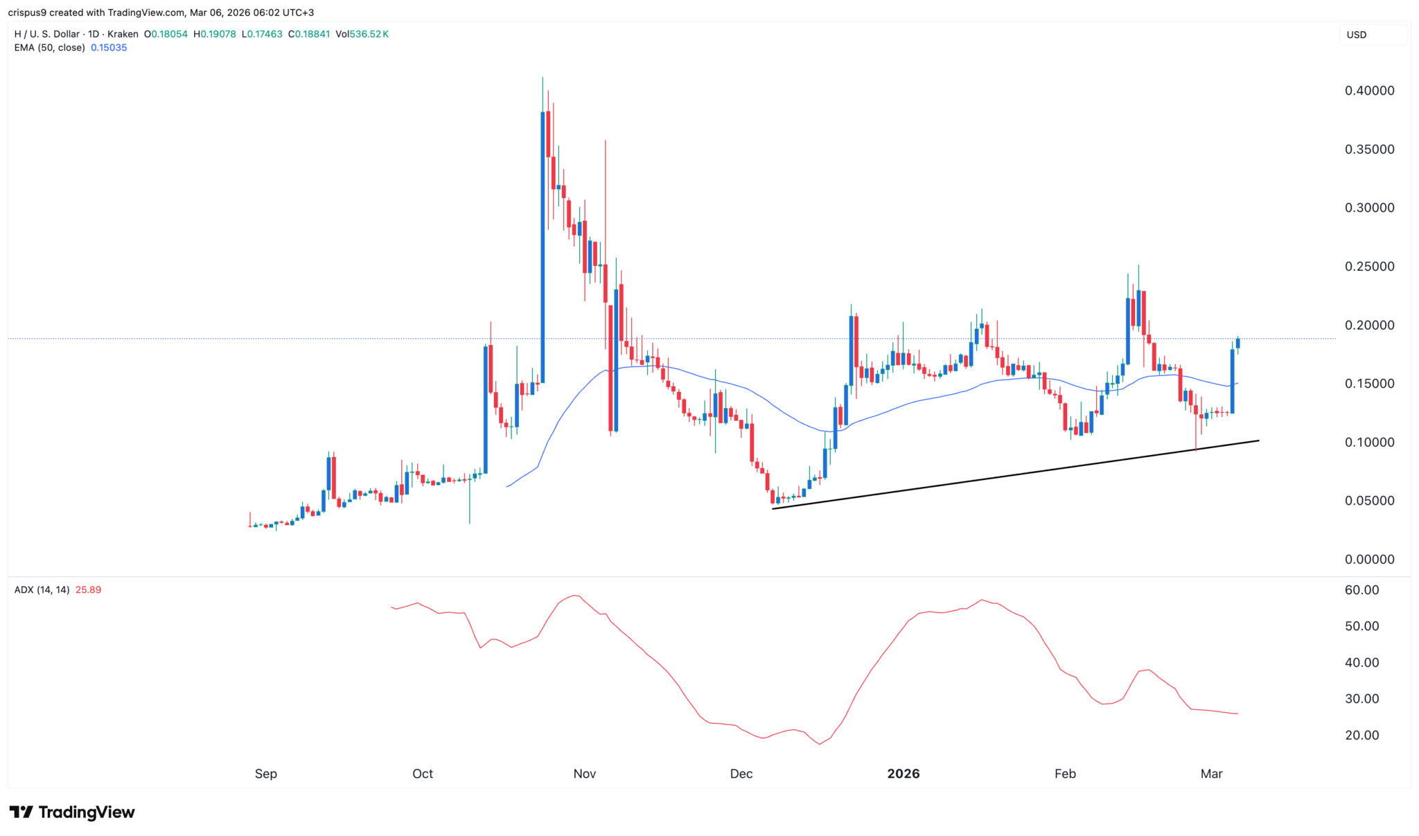 Das Tageschart zeigt, dass der Humanity Protocol-Token auf 0,1885 $ gestiegen ist, den höchsten Stand seit dem 17. Februar. Er hat sich über den exponentiellen gleitenden 50-Tage-Durchschnitt bewegt.