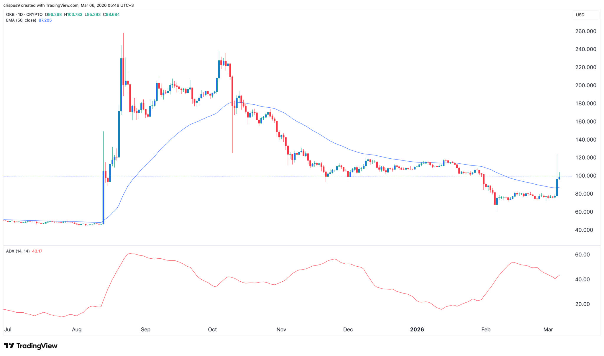 $OKB-Kursdiagramm | Quelle: TradingView Ein gutes Beispiel dafür ist der parabolische Anstieg des Tokens im August letzten Jahres, als Pläne zur Reduzierung des Umlaufangebots bekannt gegeben wurden. Der Kurs stieg innerhalb weniger Tage um über 455 % und setzte dann seinen Abwärtstrend fort.