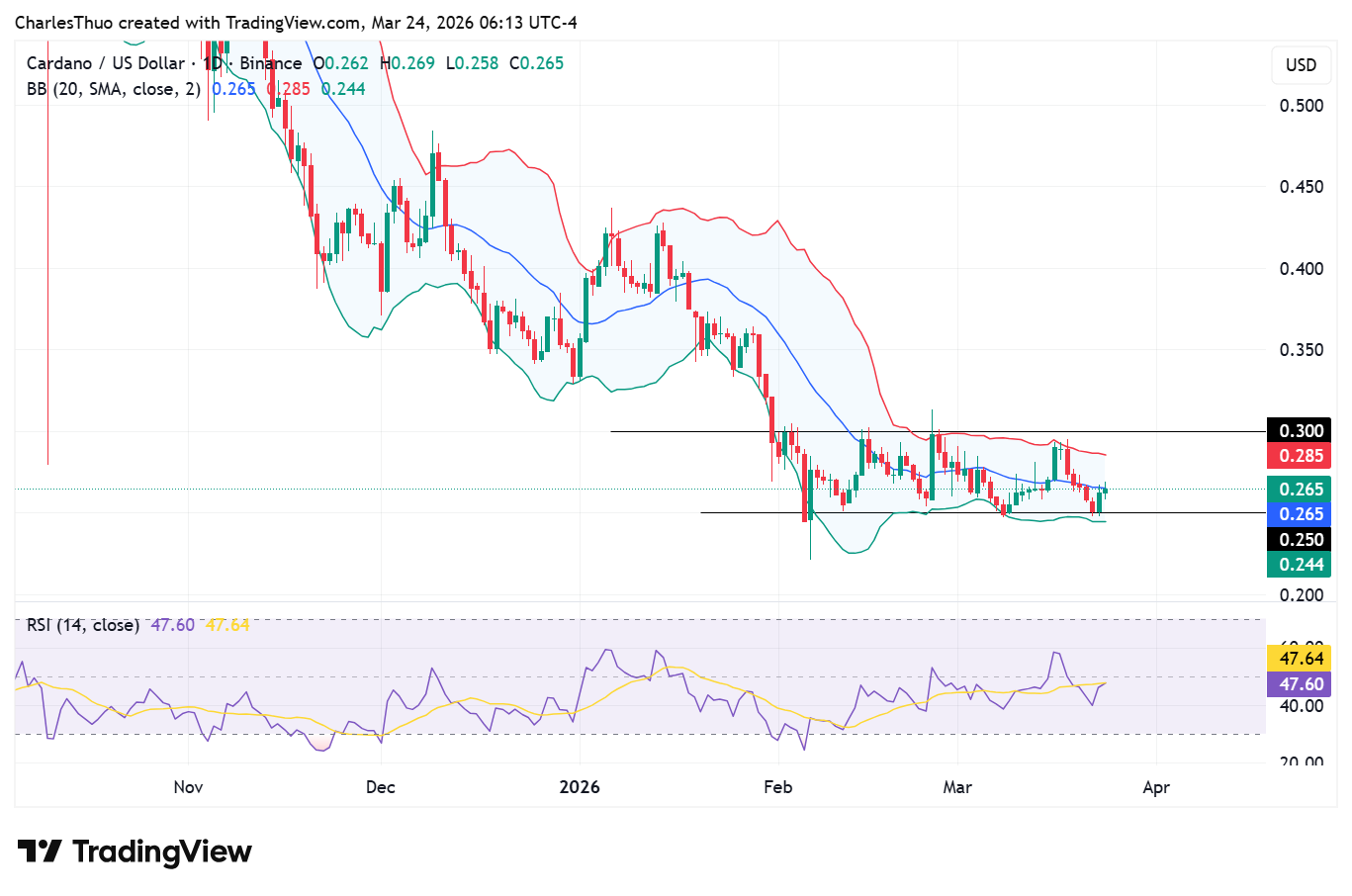 Cardano ($ADA) zeigt Anzeichen einer Stabilisierung, da es um den Unterstützungsbereich von $0.25–$0.27 schwankt.