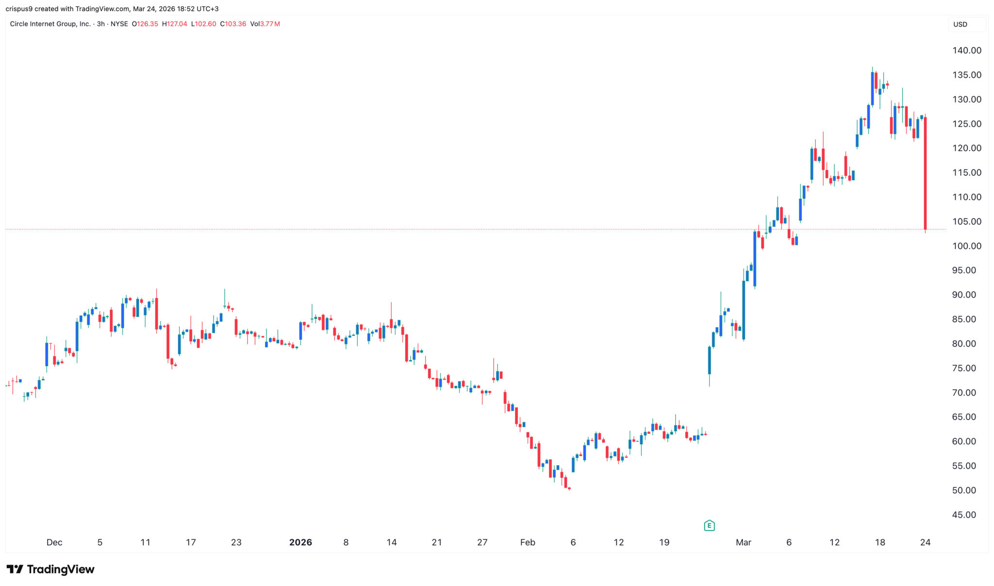 Der Kurs der Circle-Aktie erlitt heute, am 24. März, einen heftigen Einbruch, als die Anleger auf die neuesten Entwicklungen zum CLARITY Act reagierten, der klare Richtlinien für die Regulierung der Krypto-Branche schaffen soll. CRCL fiel um rund 20 % und erreichte mit 103 $ seinen tiefsten Stand seit dem 9. März dieses Jahres.