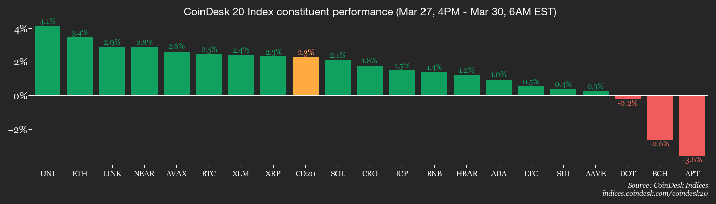 Die Preise für Ether ($ETH) und Solana (SOL) sind seit Mitternacht UTC um über 3 % gestiegen, wobei $BTC um nahezu 2 % zulegte und XRP mit 1,5 % zurückblieb. Der CoinDesk 20 Index hat um 2 % auf 1.941 Punkte zugelegt.
