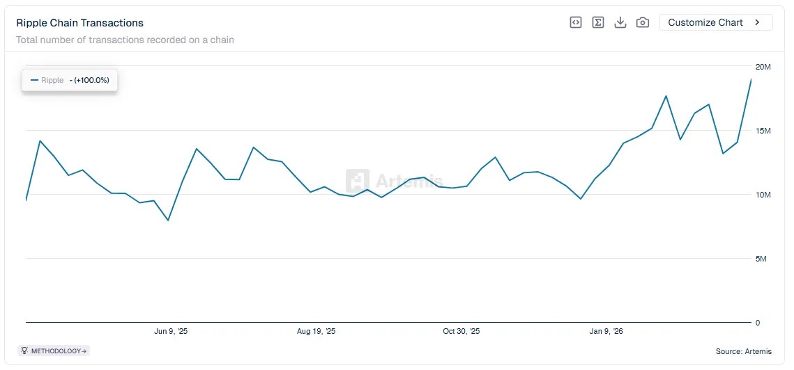 Parallel dazu zeigt sich On-Chain eine ganz andere Entwicklung. Die Aktivität im $XRP-Netzwerk ist deutlich gestiegen. Mit rund 19 Millionen Transaktionen pro Woche wurde der höchste Wert seit Anfang 2025 erreicht. Hintergrund sind unter anderem neue Entwicklungen rund um Ripple.