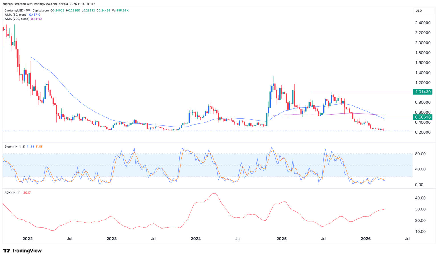 Cardano bleibt unterhalb aller gleitenden Durchschnitte, während der Stochastic Oscillator auf das überverkaufte Niveau gefallen ist. Der Average Directional Index (ADX) ist auf 30 gesprungen, seinen höchsten Stand seit Februar letzten Jahres – ein Zeichen dafür, dass sich die Abwärtsdynamik fortsetzt.