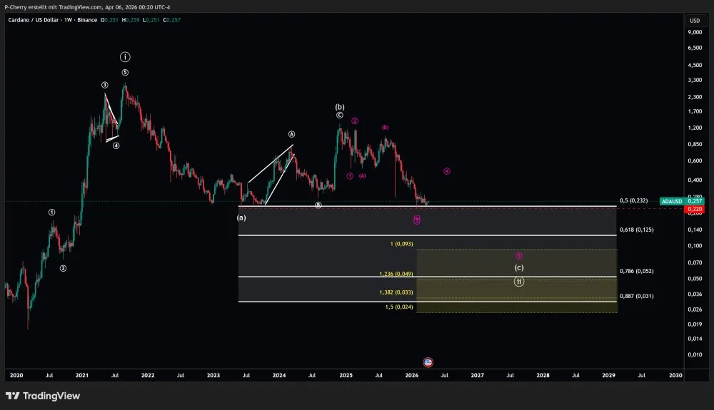 Die aktuelle Bewegung erweckt den Eindruck, als ob der $ADA-Kurs bald in die Welle 4 starten könnte. Danach wäre noch mit einer Welle 5 in einer korrektiven Struktur zu rechnen (A-B-C-Bewegung). Da die ganze Bewegung eine korrektive Struktur aufweist, sollte mit erhöhter Volatilität, in beide Richtungen, gerechnet werden.