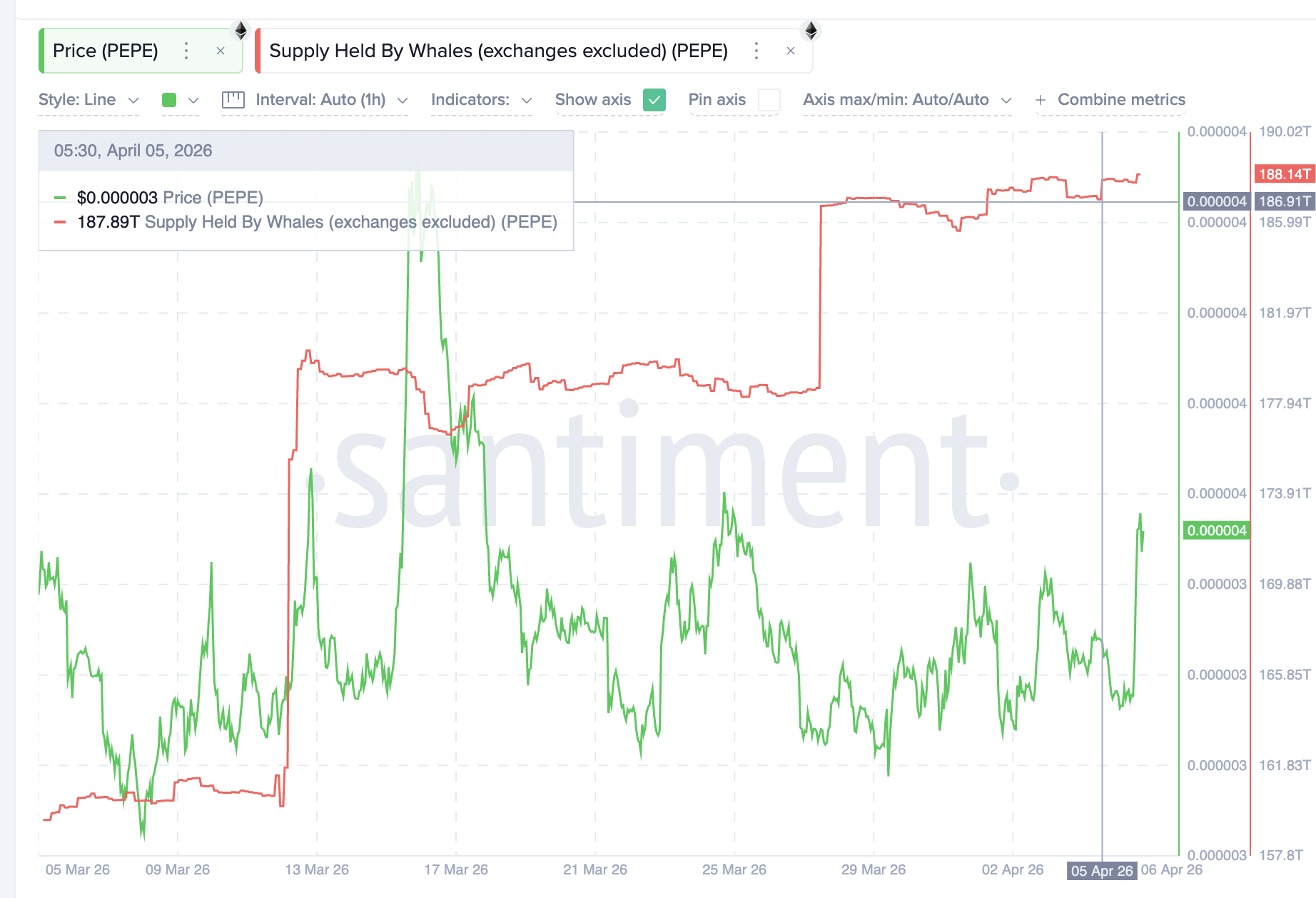 On-Chain-Daten von Santiment zeigen am 5. April einen starken Anstieg bei den Beständen großer Halter: von 186,91 Billionen auf 188,14 Billionen $PEPE. Dieser Zuwachs von 1,23 Billionen Token entspricht etwa 4,36 Millionen USD frischer Akkumulation und ist kein bloßer Transfer zwischen Wallets, denn er fällt zeitlich mit einem deutlichen Kaufimpuls im Chart zusammen.