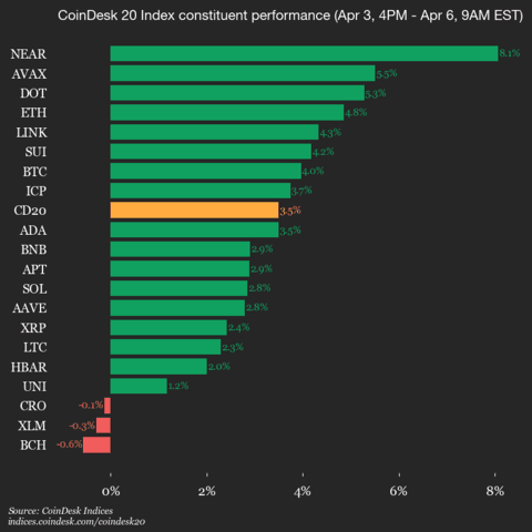 Der CoinDesk 20 notiert derzeit bei 1968,74, was einem Anstieg von 3,5 % (+66,62) seit 16 Uhr ET am Freitag entspricht.
