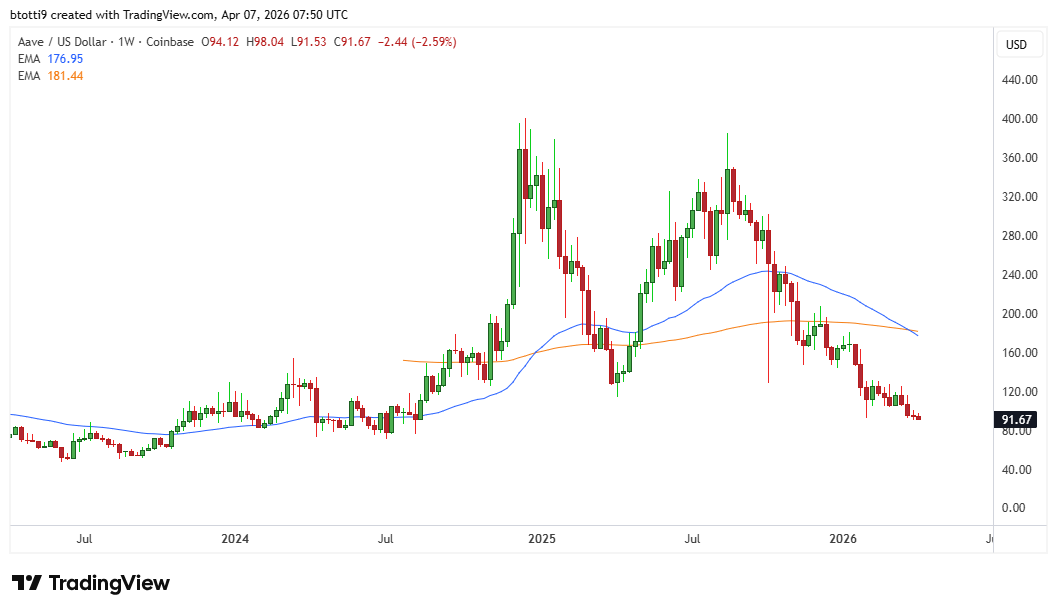 Der Governance-Token von Aave, $AAVE, notiert knapp über der Marke von $90 und liegt in den letzten 24 Stunden fast 4% im Minus.