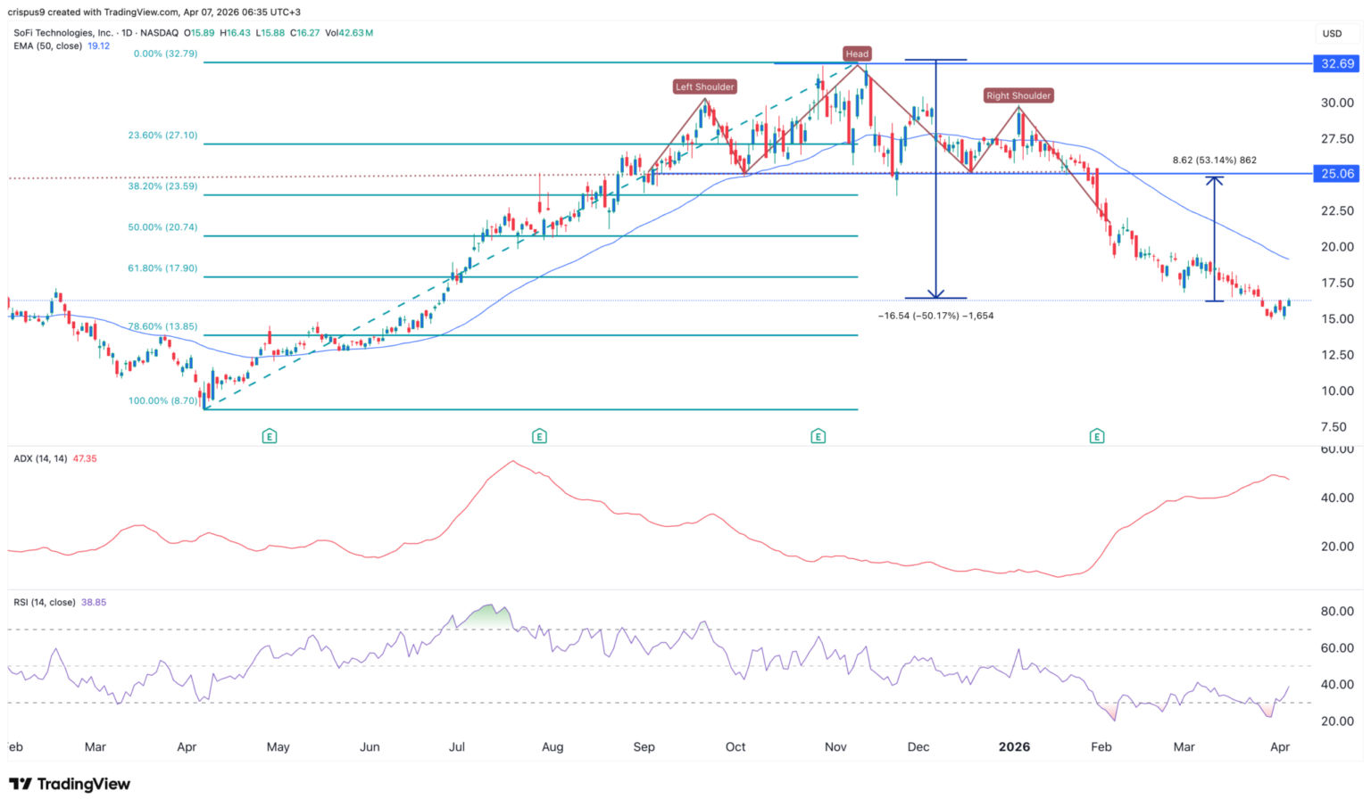 SoFi-Aktienchart | Quelle: TradingView Der Tages-Chart erklärt, warum der SoFi-Aktienkurs eingebrochen ist. Zwischen dem 2. September und Januar dieses Jahres bildete sich ein riesiges Kopf-Schulter-Muster, als der Kurs unter die Nackenlinie fiel.