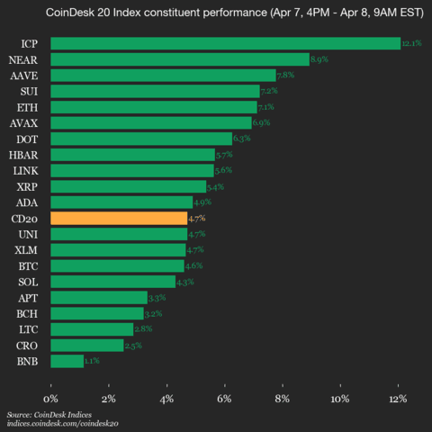 Der CoinDesk 20 wird derzeit bei 2027,7 gehandelt, ein Anstieg von 4,7 % (+91,47) seit 16:00 Uhr ET am Dienstag.