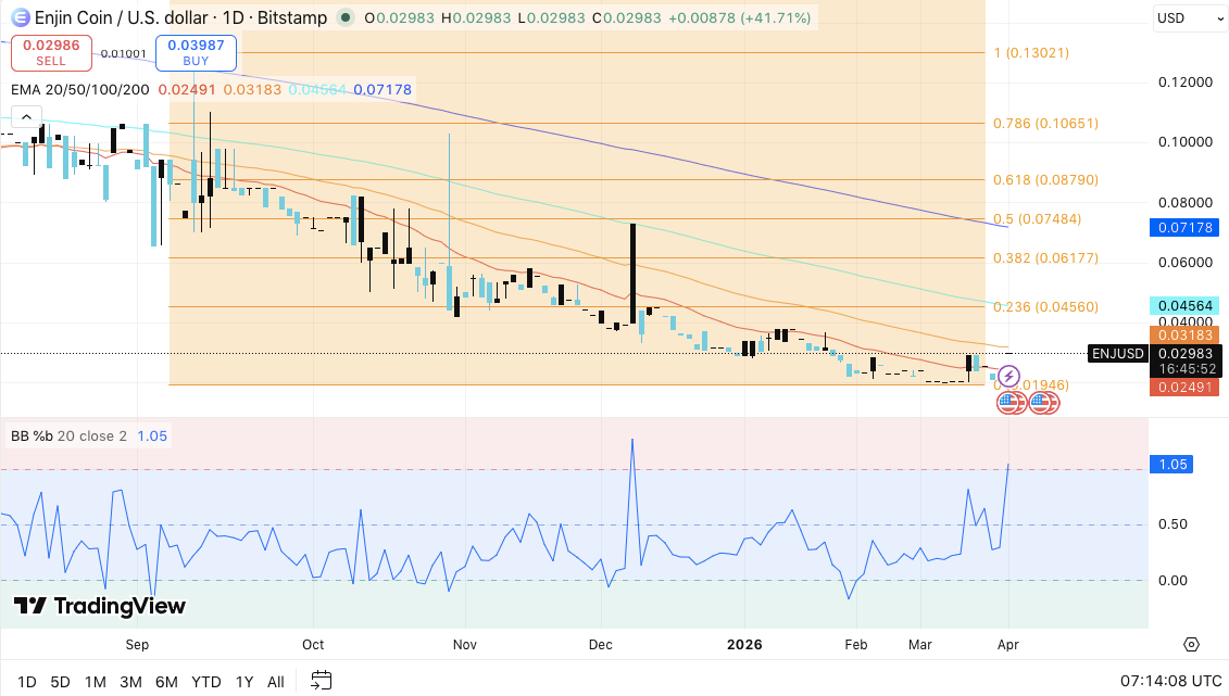 Der Preis der Enjin Coin stieg am Donnerstag stark an und zog trotz einer anhaltenden bärischen Marktstruktur erneut Aufmerksamkeit auf sich. Der Token wurde bei 0,03117 $ gehandelt, verzeichnete einen täglichen Gewinn von 52 % und ein wöchentliches Wachstum von über 51 %.