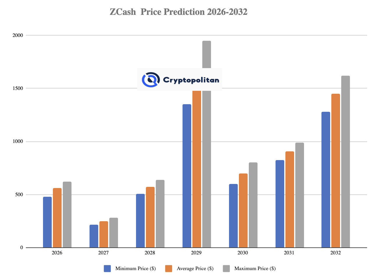 - Im Jahr 2032 wird Zcash zwischen 1.281,30 $ und 1.620,86 $ liegen