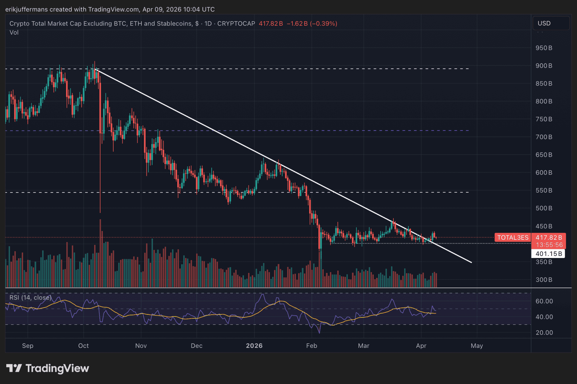 Die folgende Grafik ist die TOTAL3ES-Graphik. Sie zeigt die gesamte Marktkapitalisierung des Kryptomarkts, ohne Bitcoin, Ethereum (ETH) und Stablecoins. Diese Grafik bildet somit die Performance der Altcoins ab.