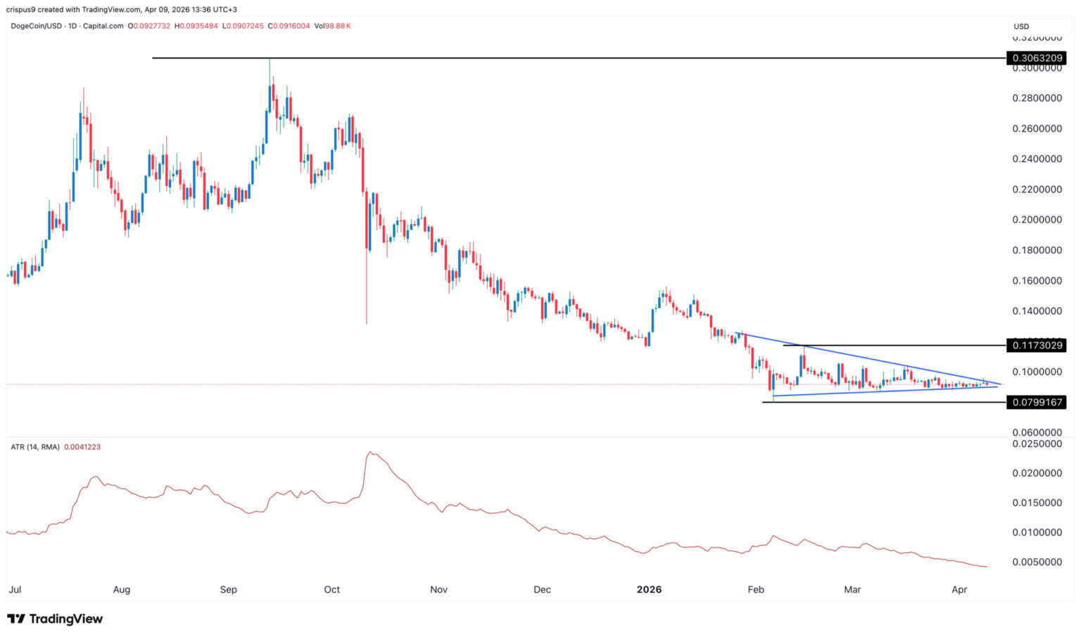 Die große Bewegung könnte in beide Richtungen erfolgen. Ein bärischer Durchbruch könnte zu einem Rückgang auf das wichtige Unterstützungsniveau bei 0,08 $ führen, während ein bullischer Ausbruch den Kurs auf 0,1172 $ treiben könnte.