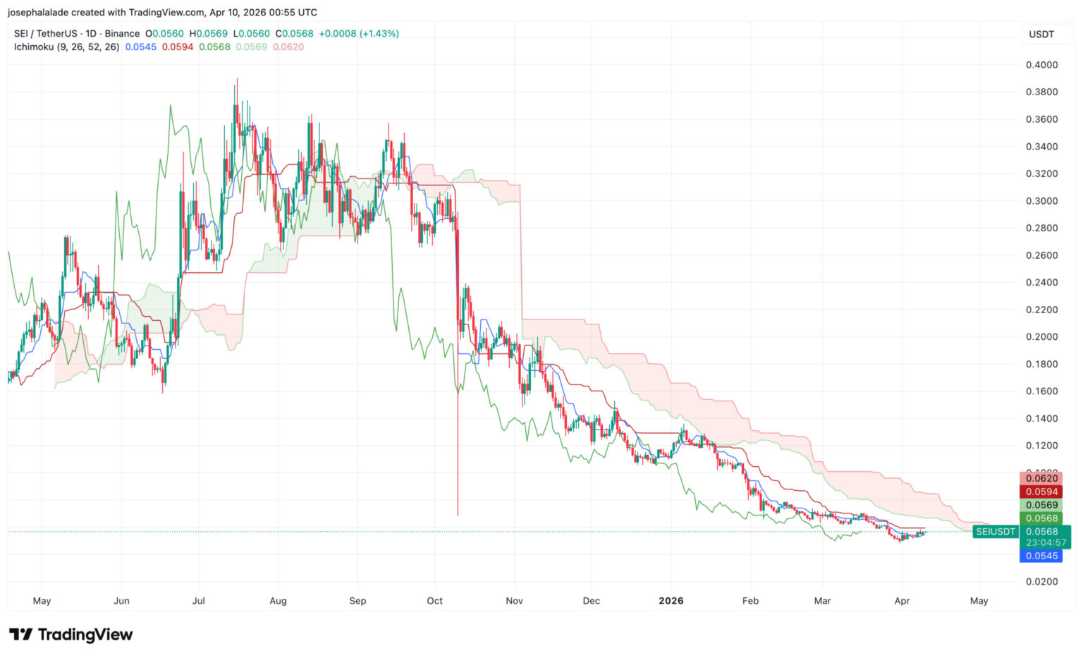 Die Ichimoku-Wolke bestätigt jede Ebene dieser Analyse. Das Chart zeigt, dass der Kurs unter die Wolke gefallen ist und diese seitdem nicht mehr getestet hat. Die Wolke selbst ist rot, fällt abwärts ab und liegt deutlich darüber, wobei die untere Grenze bei etwa 0,07–0,08 $ liegt – ein Niveau, das die $SEI-Coin seit Monaten nicht mehr erreicht hat.