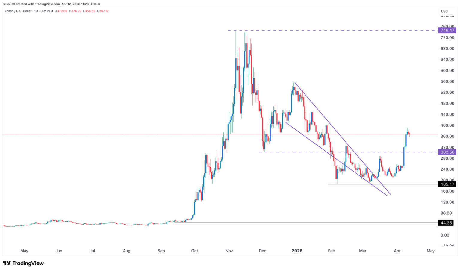 Der $ZEC-Kurs hat sich in den letzten Wochen erholt und ist von einem Tiefststand von 185 $ auf heute 366 $ gestiegen. Diese Erholung erfolgte, während Arthur Hayes weiterhin für den Token warb. Außerdem bildete sich ein Doppelmuster und ein fallender Keil.