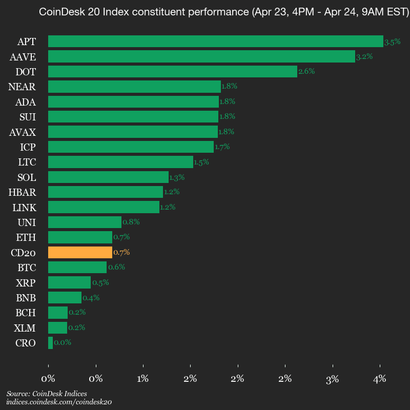 Führende: APT (+3,5 %) und AAVE (+3,2 %).